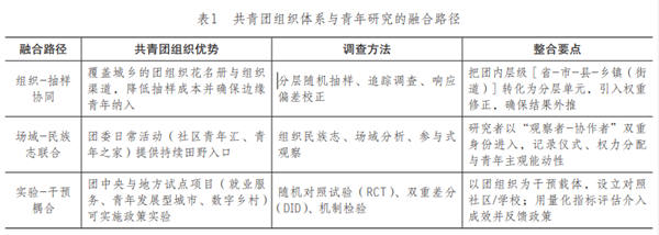 可见,组织体系与社会学方法的三种融合路径分别对应大样本代表性、田野深描机制和因果推断严谨度,它们通过共青团这一组织体系被编织进同一研究设计:抽样协同提供全局视野与横截面基底,场域民族志揭开制度操作与青年能动的缠绕肌理,实验干预则用可验证的因果链条检验政策与理论的有效张力。三者相互支撑、缺一不可,既彰显了中国制度环境对社会学方法的激活力量,也提供了在中国式现代化进程中维持学术自治的可借鉴范式。