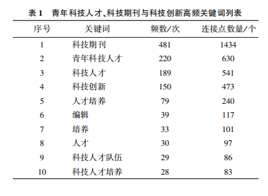运用VOSviewer软件进行关键词共现分析,选取关键词作为图谱节点类型,设置显示频数前10的关键词(表1)。研究表明,青年科技人才、科技期刊与科技创新等相关研究的主题丰富多样,且各主题之间存在着密切的联系。