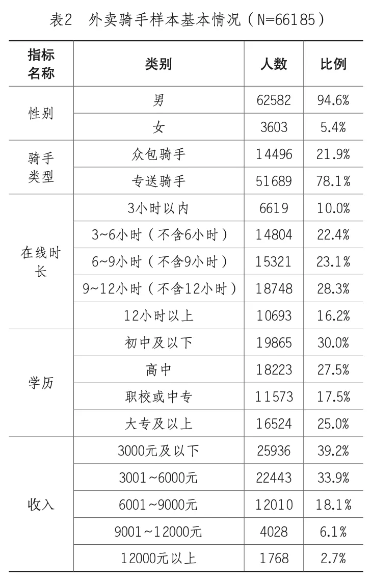 本研究数据来源于2023年南开大学与某数字平台研究院合作开展的“外卖骑手职业技能与技能形成研究”。该研究院是某生活服务平台设立的研究机构,依托平台实践与相关数据资源,长期关注灵活就业与新就业群体,围绕数字化背景下生活服务业从业者的就业与保障开展研究。研究团队于2023年采用便利抽样的方法,对某外卖平台骑手开展线上问卷调查。样本覆盖中国大陆30个省级行政区及200个城市(自治州),具有较广的地域覆盖。问卷内容包括骑手的社会人口学特征、职业技能、工作经历及收入情况等,共回收问卷72063份。为保证数据质量,研究在回收与清理阶段设置了多项质量控制措施,包括剔除同一设备或账号的重复提交、剔除答题时长异常样本、关键题项缺失筛除以及逻辑一致性检查等。经数据清理后,最终获得有效问卷66185份,有效答复率为91.84%。