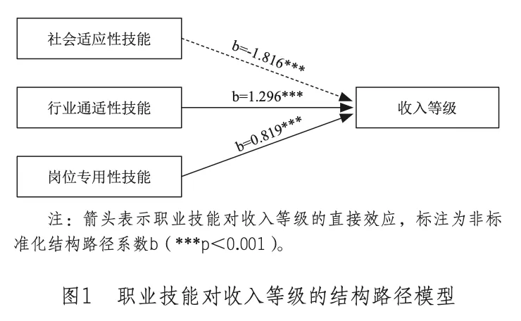 在主模型中,收入等级作为五档有序结果变量纳入结构方程框架进行估计,模型整体拟合良好(CFI=0.998,TLI=0.997,RMSEA=0.068,SRMR=0.027)。图1展示了不同类型职业技能对收入等级的结构路径关系,表4报告了相应的参数估计结果。在同时纳入社会适应性技能、行业通适性技能与岗位专用性技能的情况下,行业通适性技能对收入等级具有显著正向影响(b=1.296,p<0.001),岗位专用性技能同样呈显著正向影响(b=0.819,p<0.001)。然而,社会适应性技能显示出对收入等级的显著负向影响(b=-1.816,p<0.001)。