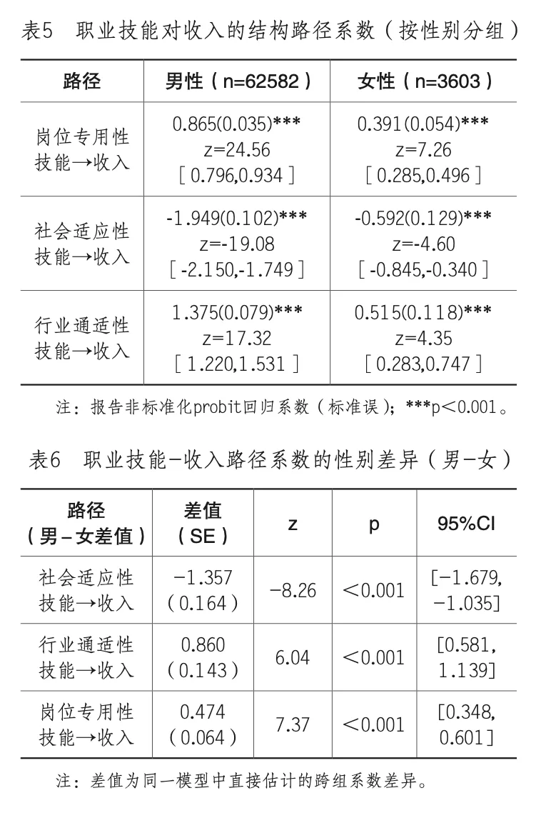 研究进一步采用多组结构方程模型(WLSMV估计)检验职业技能与收入关系的性别差异。配置不变模型与载荷不变模型比较结果显示,施加载荷相等约束并未显著降低模型拟合(Δχ2(4)=1.58,p=0.813),表明量表在性别组间具备基本可比性。在此基础上,对“三条技能→收入路径”同时施加跨组等值约束会显著降低模型拟合(Δχ2(3)=17.01,p<0.001),说明职业技能的收入回报强度在男女之间存在显著差异。从组内系数来看(见表5),三类技能对收入的影响方向在男女组中一致。进一步的跨组系数差值估计(男-女)表明(见表6),上述路径的回报强度存在显著差异。行业通适性技能与岗位专用性技能对收入的正向回报在男性中更强;社会适应性技能与收入的负向关联在男性中也更强。考虑到女性样本量相对较小,相关估计的不确定性相对更高,但主要结论在方向与显著性上保持一致。
