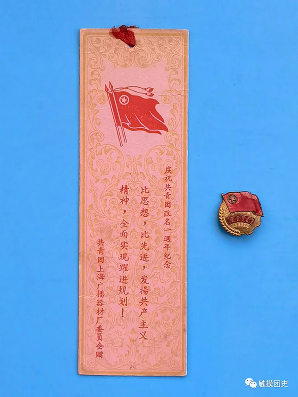 这份精致的书签,是1958年5月,为庆祝共青团改名1周年,由共青团上海广播器材厂委员会制作赠送的纪念品。
