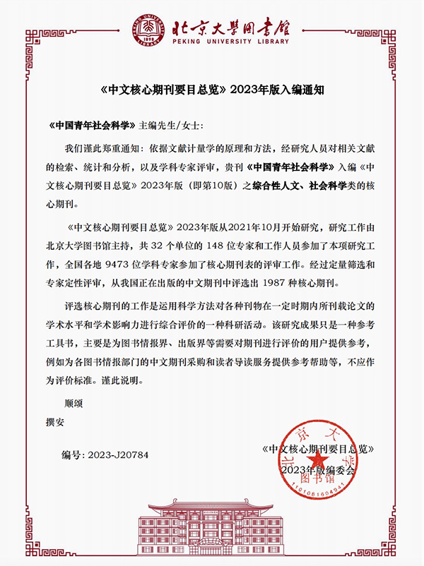 新闻中心讯 近日,《中国青年社会科学》编辑部收到北京大学图书馆《中文核心期刊要目总览》入编通知,依据文献计量学的原理和方法,经研究人员对相关文献的检索、统计和分析,以及学科专家评审,《中国青年社会科学》再次入选《中文核心期刊要目总览》2023年版(即第10版)综合性人文、社会科学类的核心期刊。