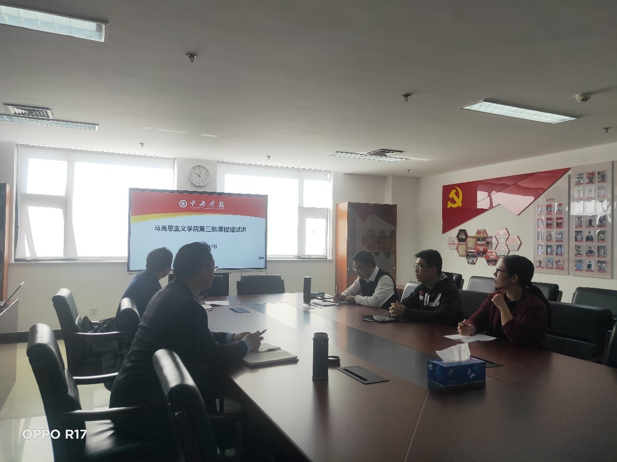 10月17日上午,马克思主义学院教师参加团中央第三批课程组院内试讲活动在办公楼401室举行。马克思主义学院院长刘长军和参加团中央第三批课程组的部分教师代表易冬冬、冯乐、荣鑫、王浩倩、张南、王瑶、左金磊参加此次试讲活动。活动由刘长军主持。